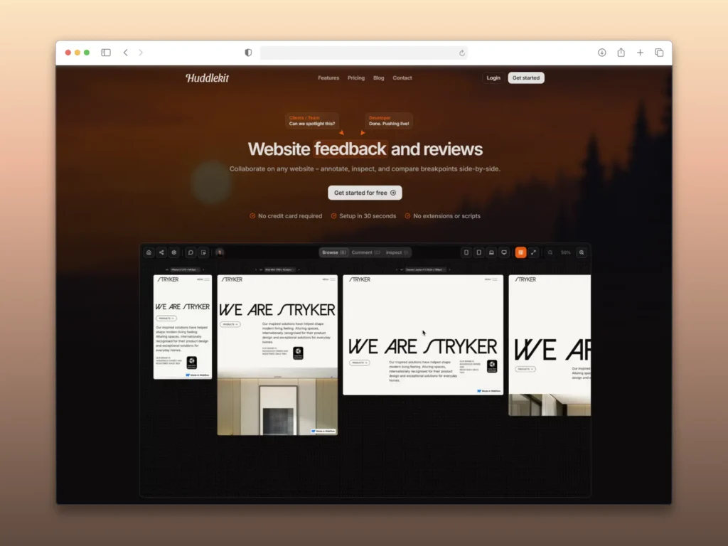 Huddlekit is a collaborative website annotation and QA tool designed for web agencies, freelancers, and product teams to review designs effortlessly. Users share a link to annotate any site, inspect styles, compare breakpoints side-by-side, and drop comments without needing extensions or scripts.