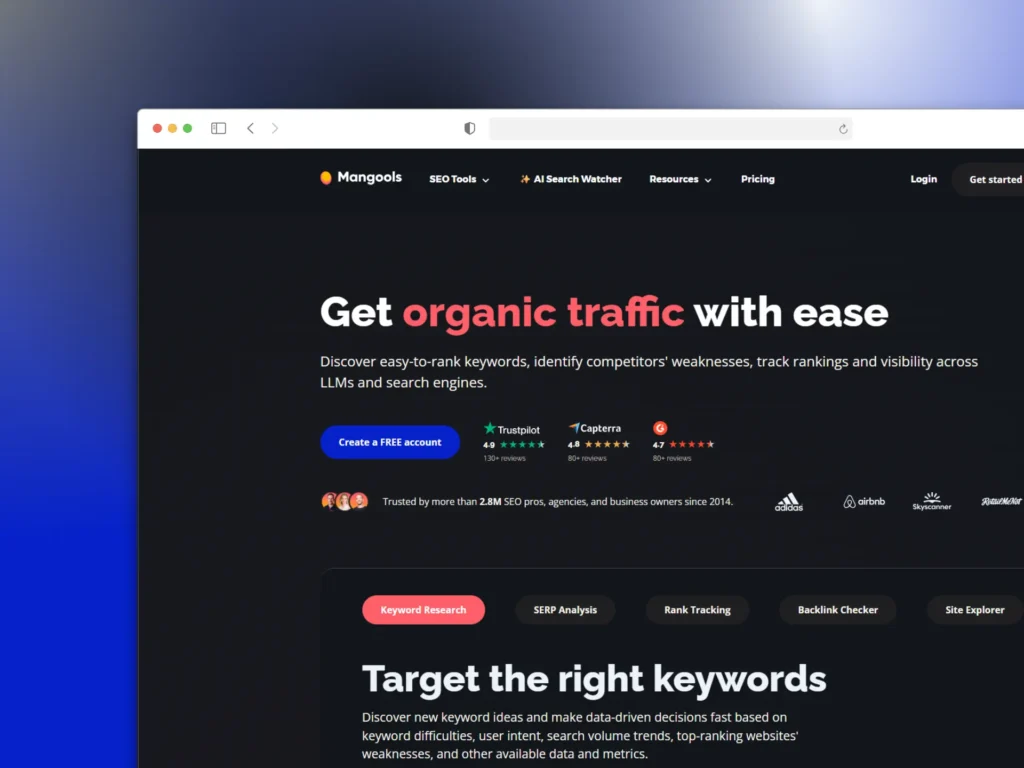 Mangools is a beginner‑friendly SEO toolkit that helps you find easy‑to‑rank keywords, analyse search results, track your rankings, and uncover backlink opportunities so you can grow your organic traffic more efficiently. It bundles several tools into one interface, making it practical for bloggers, small businesses, and agencies that want clear data without complex setups.